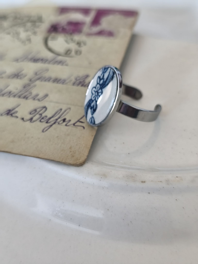 Bague en acier inoxydable, ajustable. Elle est sertie d'une pièce en faïence ovale 14x18 mm.