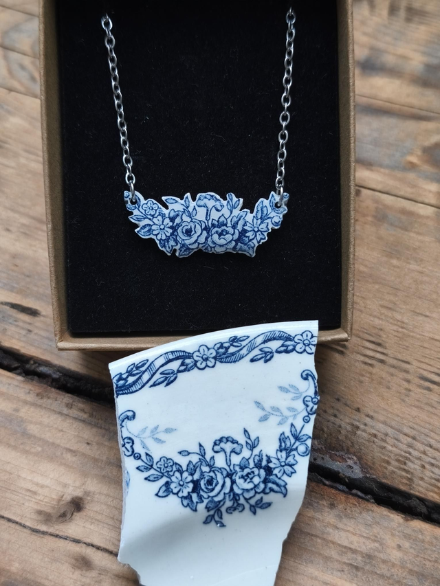 La faïence a été découpée, taillée et sculptée à la main à partir d'une assiette ancienne dans mon atelier en Franche-Comté. Chaque bijou est donc unique et éco-responsable.